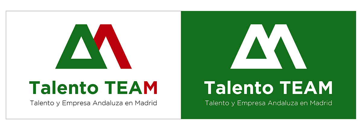 La elección tipográfica aporta un aire de seriedad y firmeza. El elemento visual que acompaña al nombre comunica de manera visual el propósito de nuestra organización: Talento Team es el espacio donde el talento andaluz en la Comunidad de Madrid converge, evidenciado por la entrelazada "A" y "M" en el fondo.